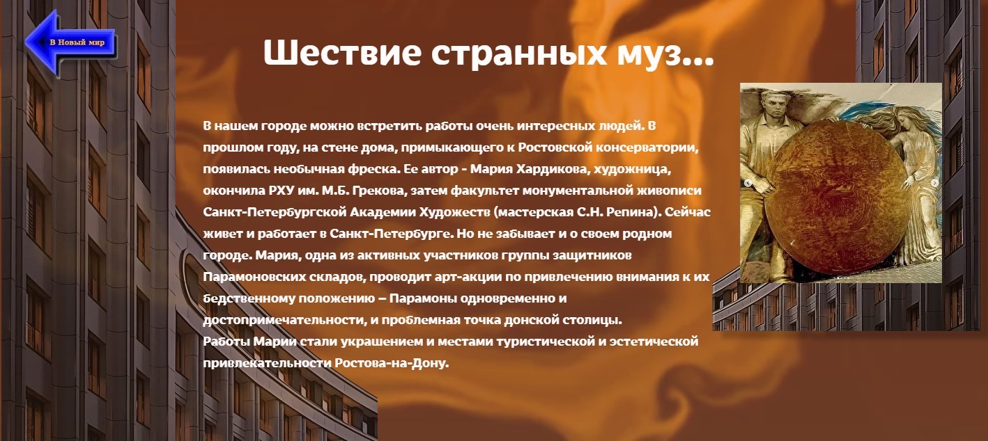 Что нас вдохновляло при работе над страницами пространства: экскурсии в художественную галерею "Ростов". Одно из самых интересных музейных пространств города. Часто меняются экспозиции, очень разные художники, проводят тематические и очень познавательные экскурсии по городу. Галерея сотрудничает с Санкт-Петербургским Институтом стрит арта и занимается исследованием этого явления в Ростове-на-Дону. Мы побывали на выставке посвященной французским комиксам. Открыли для себя новые страницы в истории графических романов. Пространство очень креативное и там приятно находиться: можно смотреть на большом экране видео, здесь проводят встречи с интересными людьми, лекции.