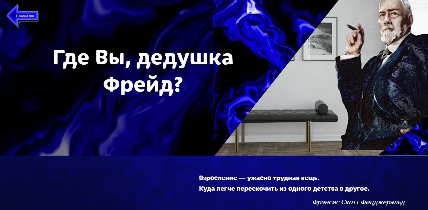 Наш самый необычный раздел: Где вы, дедушка Фрейд? Нас многое пугает и многое мы не понимаем, но пришли к выводу, что надо разбираться и выходить из тревожностей. Прохождение интенсива и полученная информация, сделали доступными нам многие стороны жизни взрослых, вывод - учиться и учиться, развивать коммуникацию между поколениями. Нам о многом надо поговорить.